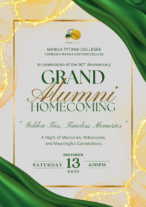 In celebration of Manila Tytana Colleges’ 50th anniversary, the Manila Tytana Colleges invites all graduates to the Grand Alumni Homecoming on December 13, 2025. With the theme “Golden Ties, Timeless Memories,” the event honors five decades of excellence, growth, and lifelong bonds. Held under the anniversary theme “Reaching Gold,” the homecoming promises a night of memories, milestones, and meaningful connections as generations of Titans come together in a spirit of gratitude and celebration.